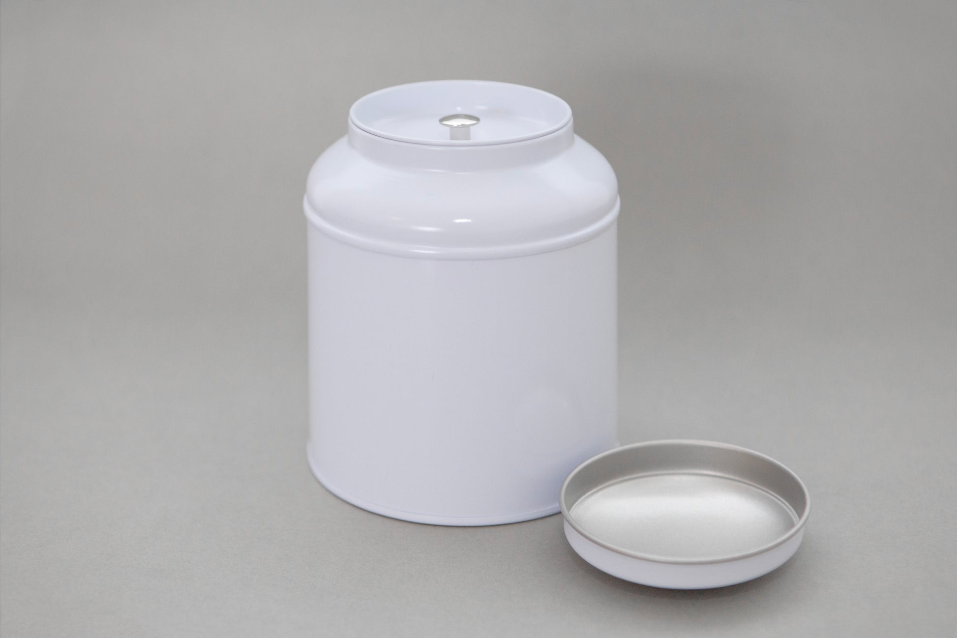Llauna blanca rodona amb doble tapa a pressió, de 9cm de diàmetre i 11,5cm d'altura.